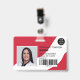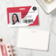 Una insignia de identificación de foto de enfermera roja editable moderna y profesional con logotipo y código de barras en disposición horizontal.