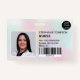 Una moderna y profesional placa de identificación fotográfica holográfica de perla nacre de la enfermera iridiscente pastel con logotipo y código de barras horizontal.