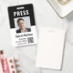 Personalice estas insignias verticales de pase de prensa con una foto y nombre de empleado, junto con tres líneas de texto personalizado adicional para título o función, medio de comunicación y fecha de validez. PRESS aparece en la parte superior en letras blancas en negrita. Personalice con un código QR en la parte frontal. Campo de texto personalizado adicional ubicado en la parte posterior para información de devolución u otros detalles.