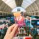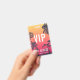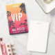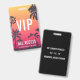 Perfecto para conciertos de verano, festivales y grandes eventos, esta credencial personalizable presenta un fondo de siluetas de palmeras contra una puesta de sol de verano roja y amarilla, con texto superpuesto en blanco. Personalice para VIP, personal, prensa u otros usos, con tres líneas de texto en la parte delantera. Agregue información adicional del evento en la parte posterior de la credencial en letras blancas sobre negro.
