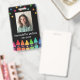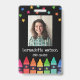Identificación de profesor de crayón vertical personalizada con foto, nombre, grado debajo de estrellas coloridas y encima de una fila de crayones en un gradiente de arcoíris. Identificación de maestro de jardín de infantes con crayones y estrellas coloridas.