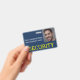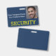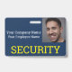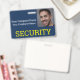 Esta insignia de identificación personalizada presenta un título "SEGURIDAD" impreso en amarillo en la parte inferior sobre un fondo azul. Una foto de muestra de un guardia de seguridad se coloca a la derecha, que puede personalizar para incluir su propia identificación fotográfica. El nombre de la empresa y el nombre del empleado se imprimen a la izquierda de la imagen.