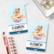 Insignia de nombre personalizada con una linda pintura acuarela de una madre león sosteniendo su cachorro de bebé. Un ramo de flores moradas de bonito debajo de ellas aporta un toque agradable a esta imagen dulce y adorable. Fondo azul claro.