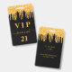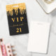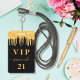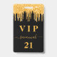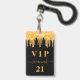 Una insignia moderna, elegante y glamurosa para una fiesta de cumpleaños de 21 años (o cualquier edad). Un fondo negro con un efecto de brillo dorado falso que gotea, con un estilo de pintura que gotea. El nombre está escrito con un estilo de letra manuscrita moderna con florituras. Con el texto: VIP El número 21 está escrito en color dorado. Para mantener las florituras, simplemente elimine el nombre de muestra, deje los espacios o emojis delante y detrás del nombre.