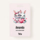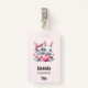 Name tag with an illustration featuring 2 white furry bunnies sharing a big pink heart. The girl bunny is wearing a cute bow on her head and heart-shaped glasses. The boy bunny is wearing an adorable little suit with a tie.