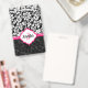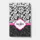 Elegante damasco floral vintage blanco y negro con acentos rosados. Monograma personalizado