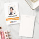 Una tarjeta de identificación empresarial moderna que incluye la foto, nombre y ocupación de un miembro del personal. La identificación del empleado moderno también incluye el nombre y logotipo de la empresa. El color de cualquier elemento de diseño de esta tarjeta de identificación del personal se puede personalizar.