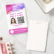 Ideal para cualquier trabajador de atención, negocio de atención domiciliaria o persona autónoma. Edite fácilmente esta plantilla para subir su propia foto de identificación, código QR de vacuna y datos personales. Además, información de 'devuelva amablemente' en la parte trasera. Arte abstracto único con tonos de acuarela en rosa, púrpura y dorado. Tarjeta de identificación de empleado rosa con código QR para foto
