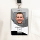 Tarjeta de identificación de foto con un diseño en blanco y negro con un espacio para la foto y el logo de tu personalizado. En la parte posterior puede agregar un código de barras personalizado o código QR y textos adicionales o eliminar las plantillas. También puede copiar y pegar el diseño y las fotos de la parte delantera a la trasera si lo desea.