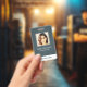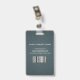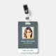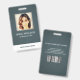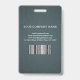 Tarjeta de identificación de identificación de negocio de foto moderna con código de barras sobre un fondo de lienzo azul grisáceo. Se puede agregar información adicional en el reverso de esta credencial de empresa