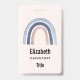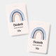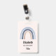 Etiqueta de nombre con un arco iris bonito y caprichoso. Acuarelas azules y melocotones.
