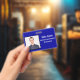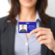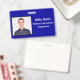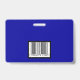 Identificador de empleado horizontal con fondo azul real. Todos los elementos son cambiables o extraíbles. Los elementos incluyen: foto de empleado, nombre de empleado, nombre de empresa, departamento de empleado. La parte posterior del diseño tiene un análisis de código de barras de seguridad. Disponible en orientación horizontal. Ranura en la parte superior para el patio.