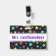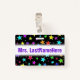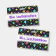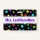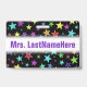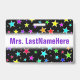 Esta diversión, características del diseño multicoloras de la insignia un modelo de las formas de la estrella de diversos tamaños y coloreadas una variedad de colores en un fondo negro. También ofrece un nombre personalizado en texto coloreado púrpura dentro de un área coloreada blanco. Una insignia como esto se podía quizás llevar por un profesor, un educador, un profesor particular o un profesor durante las semanas tempranas de un año escolar o de un curso. Puede ser que ayude a los estudiantes a aprender y a recordar el nombre de su profesor. [~Z0000175]