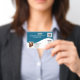 Un diseño de orientación horizontal sencillo pero llamativo que tiene una línea ondulada en el medio divide un color azul oscuro del fondo blanco en el que aparecen las plantillas para el nombre de la empresa, los detalles del empleado y la dirección del negocio. Hay una plantilla para el logotipo de su empresa y la foto de sus empleados (en posición vertical) también. Personalice la plantilla para que se ajuste a sus necesidades y cambie el color de fondo detrás del separador ondulado a cualquiera de sus opciones personales.