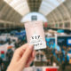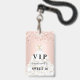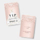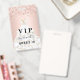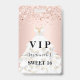 Una insignia moderna, elegante y glamurosa para una fiesta de cumpleaños Sweet 16, 16. Un fondo rosa claro con confeti y un vestido blanco. Con el texto: VIP. Personalice y agregue nombre, edad, fecha/dirección. El nombre está escrito con un estilo de letra manuscrita moderna con florituras.