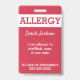 El personalizado rojo embroma la insignia amonestadora roja de la alarma de la alergia alimentaria. Fijación vía un acollador, un clip metálico, o un clip retractable a una bolsa de libros, equipo de la medicina o para que un niño lleve. Personalizar con sus alergias, contacto Info o instrucciones de la emergencia. Corrija para cambiar colores de fondo de la fuente y o estilo del texto. El Info se puede escribir en frente o parte trasera. www.LilAllergyAdvocates.com