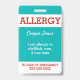El personalizado verde azulado embroma la insignia amonestadora roja de la alarma de la alergia alimentaria. Fijación vía un acollador, un clip metálico, o un clip retractable a una bolsa de libros, equipo de la medicina o para que un niño lleve. Personalizar con sus alergias, contacto Info o instrucciones de la emergencia. Corrija para cambiar colores de fondo de la fuente y o estilo del texto. El Info se puede escribir en frente o parte trasera. www.LilAllergyAdvocates.com