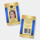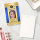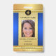 Elegante diseño de insignia de identificación con foto en oro y azul con espacio para tu foto y logotipo personalizados. En la parte posterior puedes agregar un código de barras o código QR personalizado y textos adicionales o eliminar las plantillas. También puedes copiar y pegar el diseño y las fotos de la parte frontal a la parte posterior si lo deseas.