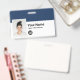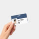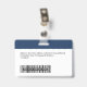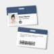 Personalice fácilmente este distintivo de nombre de empleado Personalizado con foto, código de barras de exploración y logotipo de negocios, con clip metalizado incluido. Un sencillo diseño de negocio alineado a la izquierda en colores azul marino y blanco personalizable completamente en tamaño delantero y trasero, sans-serif fuentes básicas y modernas y un aspecto profesional y claro. Disponible con o sin patio, clip metalizado o retráctil. Sin orden mínima.