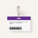 Personalice fácilmente este distintivo de nombre de empleado Personalizado con foto, código de barras de exploración y logotipo de negocios, con clip metalizado incluido. Un sencillo diseño de negocio alineado a la izquierda en colores profundos morados y blancos personalizable completamente en tamaño frontal y trasero, sans-serif fuentes básicas y modernas y un aspecto profesional y claro. Disponible con o sin patio, clip metalizado o retráctil. Sin orden mínima.