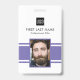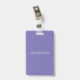 Insignia de identificación personal de la oficina de negocios con fondo morado y blanco, foto del empleado, logo, nombre y profesión de su empresa.