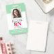 Tarjeta de identificación moderna de enfermera registrada RN con foto. Diseño con fondo verde médico y blanco, foto única, nombre del hospital, profesión y nombre. Personalice con su código de barras y detalles de contacto. Las tarjetas de identificación modernas hacen que sea sencillo para los clientes identificar a los empleados. Para editar esta plantilla, haga clic en personalizar más.