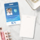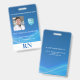 Crifal de Enfermería Registrada Vertical (u otro según pueda cambiar iniciales y descripción del trabajo utilizando las casillas de texto proporcionadas) Placa de identificación con foto. Diseño con fondo azul con diseño de onda de luz ondulante -haciendo difícil replicar el diseño por parte de impostores- Agregue fácilmente el logotipo de su empresa utilizando nuestra imagen de plantilla. Iniciales de RN en la parte inferior en azul sobre franja rectangular blanca NOTA: si utiliza un SISTEMA DE COMPAÑERO: el rectángulo blanco y el texto de las iniciales pueden cambiarse a cualquier otro color que necesite seleccionando personalizar más. Id con foto, nombre, nombre de la empresa/hospital y número de identificación. Parte posterior con área para información en caso de que se pierda la placa. También disponible en presentación horizontal. Para todo el personal médico en las líneas, GRACIAS POR SU SERVICIO INCREÍBLE.