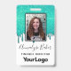 Purpurina falsa que gotea con destellos encantadores detrás de una plantilla de foto con marco en blanco y negro. Actualice fácilmente el nombre y el título del trabajo profesional para cada distintivo de empleado personalizado. También hay espacio para un código de barras de empleado o logotipo de la empresa; elimine para dejar en blanco. La parte posterior presenta más gotas de purpurina falsa y una plantilla de imagen perfecta para otro logotipo de la empresa. Disponible en muchos otros estilos y colores.