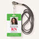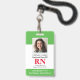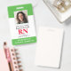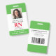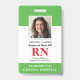 Foto moderna de RN Insignia de Enfermera registrada. Diseño con fondo verde y blanco médico, foto individual, nombre del hospital, profesión y nombre. Personalice su código de barras y detalles de contacto. Las tarjetas de identificación modernas facilitan la identificación de los empleados por los clientes y clientes. Para editar esta plantilla, haga clic en personalizar más adelante.