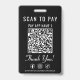 Obtenga dinero en cualquier lugar donde haga negocios con esta insignia limpia y profesional de códigos QR de pago Scan to Pay 2 de color negro. Esta insignia ligera permite a los clientes enviar pagos al instante con un escaneo rápido, perfecto para servicios móviles, eventos concurridos y checkout en movimiento. El diseño minimalista presenta una moderna letra blanca, una llamada audaz para escanear y pagar, códigos QR claramente centrados en cada lado, un amigable mensaje de "Gracias" y sus identificadores de redes sociales de Facebook, Instagram y TikTok. Ideal para vendedores, artistas, camareros, estilistas, maquilladores, conductores de entrega, vendedores de mercado y personal de eventos, esta insignia de pago portátil mantiene el checkout rápido, sin contacto y conveniente, sin necesidad de espacio en el mostrador.