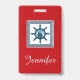 Diseño de temática náutica con decoración de escenas de vela en cuadrados rayados sobre fondo rojo con nombre