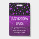 Purpurina metálica morada falsa brilla detrás de un pase de baño y pasillo fácil de leer y actualizar. Actualice el texto para mostrar el nombre del profesor y la escuela, así como el propósito de la insignia. Disponible en muchos otros colores brillantes y diseños de estrellas.
