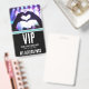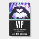 Tarjeta especial de evento VIP Ticket All Access Ideal para conciertos, grandes eventos especiales como conferencias, conferenciantes y hasta para una fiesta de cumpleaños. Presenta una tierna obra en una sala de conciertos en la que alguien sostiene sus manos en una sombra cardíaca. En el fondo se mezclan los colores morados, azules y blancos de las luces de los conciertos. Hay una banda azul, pero puedes cambiarla a cualquier cosa. En la parte inferior hay un tipo de letra negrita con VIP, el nombre del evento, la fecha y 'All Access Pass'. Puede cambiar toda la información de texto y los colores de esta insignia. Incluso puedes usar una foto diferente si quieres.