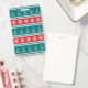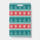 Ilustración de Feliz Navidad con árbol de Navidad y decoración de copos de nieve en fondo a rayas rojas, blancas, azules y turquesas