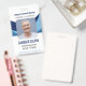 Insignia de identificación de empleado azul, azul marino y blanco con formas en tres tonos azules. Identificador de empleado personalizado con nombre, título, número de identificación y código de barras en la parte posterior.