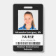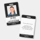 Mantenga seguro su hospital o consultorio médico con identificaciones personalizadas con la foto, nombre, título de trabajo, número de identificación y código de barras de sus empleados, así como el nombre del negocio. También puede incluir un departamento si lo desea. Perfecto para una enfermera o personal. En la parte posterior puede agregar más información, como dónde devolver la identificación si se pierde. Personalícela con una foto, código de barras y texto personalizado en la barra lateral. La foto cuadrada tiene un borde blanco delgado sobre un fondo negro. Una banda blanca cerca de la parte inferior resalta el código de barras, el título del trabajo y el número de identificación en texto negro. El nombre de la persona del personal y el texto del hospital o negocio es blanco sobre negro.