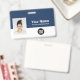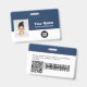 Personalice fácilmente esta Tarjeta de identificación de empleado con foto, código Qr, código de barras de escaneo y logotipo comercial, con cordón incluido. Un diseño empresarial simple en colores azul marino y blanco totalmente personalizable en tamaños delanteros y traseros, fuentes básicas y modernas sans-serif y una apariencia profesional y clara. Disponible con o sin cordón, clip de metal o retráctil. Sin pedido mínimo.