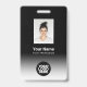 Personalice fácilmente esta placa de identificación de empleado con foto, código de barras de escaneo y logotipo comercial con un gradiente ombre blanco en el color de fondo. Un diseño empresarial simple en colores negro y blanco totalmente personalizable en tamaños delanteros y traseros, fuentes básicas y modernas sans-serif y una apariencia profesional y clara. Disponible con cordón, clip de metal o con retractil. Sin pedido mínimo.