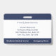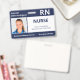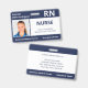 Mantenga seguro su hospital o consultorio médico con identificaciones personalizadas horizontales con la foto de su empleado, nombre, abreviatura del trabajo profesional, título del trabajo, número de identificación y nombre del negocio. También puede incluir un departamento si lo desea. Perfecto para una enfermera u otro personal. En la parte posterior puede agregar más información, como dónde devolver la identificación si se pierde. Personalícela con una foto y texto personalizado en la barra lateral. La foto cuadrada de la izquierda tiene un borde blanco delgado rodeado de franjas azules marinas en la parte superior e inferior y líneas azules marinas delgadas a sus lados. Un bloque blanco en el lado derecho central resalta el título del trabajo, el número de identificación y la fecha de vencimiento en texto azul oscuro. El nombre del miembro del personal, el acrónimo del trabajo y el texto del hospital o negocio son blancos sobre azul marino.