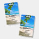 Etiqueta con el nombre del invitado con una fotografía encantadora. Una playa de arena blanca con agua azul celeste. Imagen relajante con un cielo soleado y suave oleaje espumoso con algunas hojas tropicales lindas enmarcando la imagen.