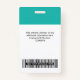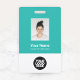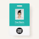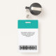 Personalice fácilmente este distintivo de nombre de empleado del Personalizado turquesa azul claro con foto, código de barras de escaneo y logotipo comercial. Un sencillo diseño de negocio con colores verde azulados, turquesa y blanco estándar, personalizable completo en tamaños frontales y traseros, fuentes sans-serif básicas y modernas y un aspecto profesional y claro. Disponible con patio, clip metalizado o retráctil. Sin orden mínima.