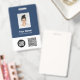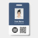 Personalice fácilmente este distintivo de nombre de empleado del Personalizado con foto, escanear código QrCode y código de barras y logotipo de negocio. Un sencillo diseño de negocio en colores azul marino y blanco personalizable completamente en tamaño frontal y posterior, sans-serif fuentes básicas y modernas y un aspecto profesional y claro. Disponible con patio, clip metalizado o retráctil. Sin orden mínima.