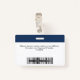 Personalice fácilmente este distintivo de nombre de empleado Personalizado con foto, código de barras de exploración y logotipo de negocios, con lanyard incluido. Un sencillo diseño de negocio en colores azul marino y blanco personalizable completamente en tamaño frontal y posterior, sans-serif fuentes básicas y modernas y un aspecto profesional y claro. Disponible con o sin patio, clip metalizado o retráctil. Sin orden mínima.