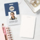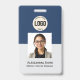 Foto de empleado personalizado, código de barras, logotipo, distintivo de nombre, identificación, tarjeta de identificación Personaliza fácilmente este distintivo de nombre de empleado Personalizado con foto, código de barras de exploración y logotipo de empresa. Un sencillo diseño de negocio en colores azul marino y blanco personalizable completamente en tamaño frontal y posterior, sans-serif fuentes básicas y modernas y un aspecto profesional y claro. Disponible con patio, clip metalizado o retráctil. Sin pedido mínimo. empresa, empleado, estándar, clásico, minorista, pequeña empresa, insignia de empleado personalizado, hospital, clínica