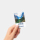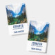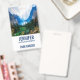 Etiqueta con una hermosa fotografía de un escenario natural agradable y tranquilo. Vibrante bosque verde en la parte frontal y montañas azules sombrías en la parte posterior. Con un cielo blanco nublado y soñador. Ambiente brumoso y mágico. Perfecto para profesiones al aire libre.