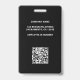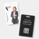 Insignia moderna, elegante y profesional para la identificación de negocios. El diseño incluye un marcador de posición de fotos recortado para mostrar su propia foto comercial recortada, el logo, nombre y título de su empresa en el frente. Personalice más con los detalles de su empresa, código qr en la parte posterior. Para que el diseño se parezca a la plantilla de ejemplo, cargue su foto personal de negocios con un fondo transparente o blanco en formato PNG. El tipo de letra, el tamaño del texto y los colores se pueden personalizar.