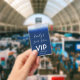 A sus invitados les encantará esta invitación única VIP pass dulce 16 badge. Este moderno diseño presenta un fondo azul marino, luces de verano y fuentes caligráficas.