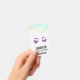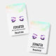 Una etiqueta con un bonito ilustracion pintado de acuarela. Bonito ojos y cejas púrpuras, ojos cerrados que muestran largas y elegantes pestañas. Borde abstracto a lo largo de la parte superior, con colores rápidos verdes, azules y rosados.