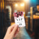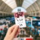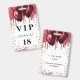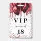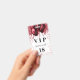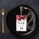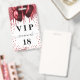 Una insignia moderna, elegante y glamorosa para una fiesta de cumpleaños de 18 años (o cualquier edad). Un fondo blanco con gotas de brillo falsas rojas y globos rojos. Con el texto: VIP. Personalice y agregue nombre, edad, dirección/fecha. El nombre está escrito con un estilo de letra manuscrita moderna con florituras. Para mantener las florituras, elimine el nombre de ejemplo, deje los espacios o emojis delante y detrás del nombre.