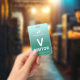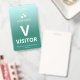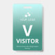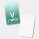 Insignia vertical de visitante con un diseño sencillo contra un gradiente de azul pálido a verde azulado Una gran V blanca hace fácil reconocer rápidamente al visitante como tal. Personalice con el logotipo de su empresa.